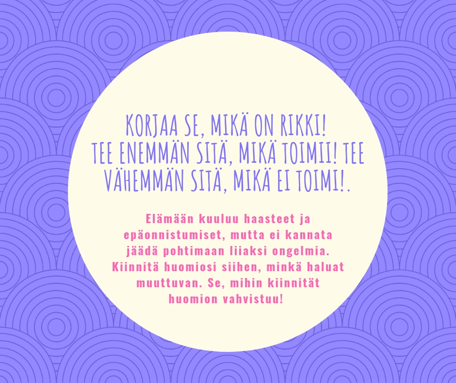 Tee enemmän sitä, mikä toimii on hyvä neuvo kenelle tahansa. Ole myös sellainen kuin oikeasti olet. Jokaisen meistä olisi hyvä joskus syventyä miettimään, olenko juuri sellainen ihmisenä kuin oikeasti olen vai yritänkö olla jotakin muuta? Tuohan ei pidemmän päälle tule toimimaan, jos päivästä toiseen yrität olla jotakin muuta, mitä et oikeasti ole...